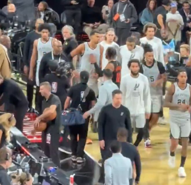 赛后布伦森与马刺全队握手时,文班亚马也没有理会布伦森,还是布伦森拍了一拍文班亚马的胸口,文班亚马直接就走了。他全场比赛17中7,三分6中2,拿到18分6篮板1助攻1抢断2盖帽。