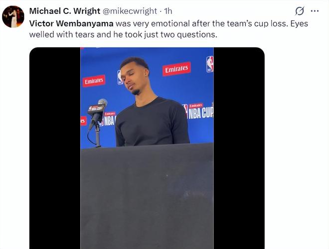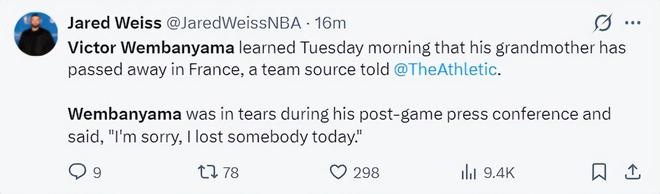 杰德-韦斯报道:在周二早上(杯赛决赛前)文班亚马得知自己的祖母去世了,在新闻发布会现场文班亚马的情绪激动。