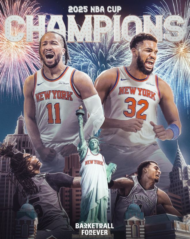 尼克斯大胜马刺拿到2025年的杯赛冠军,三届冠军分别是湖人、雄鹿、尼克斯,布伦森也成为詹姆斯、扬尼斯后第三位杯赛的MVP。淘汰联盟第一雷霆的马刺此役是一败涂地,文班亚马这位超级巨星也被唐斯+米罗直接碾碎。
